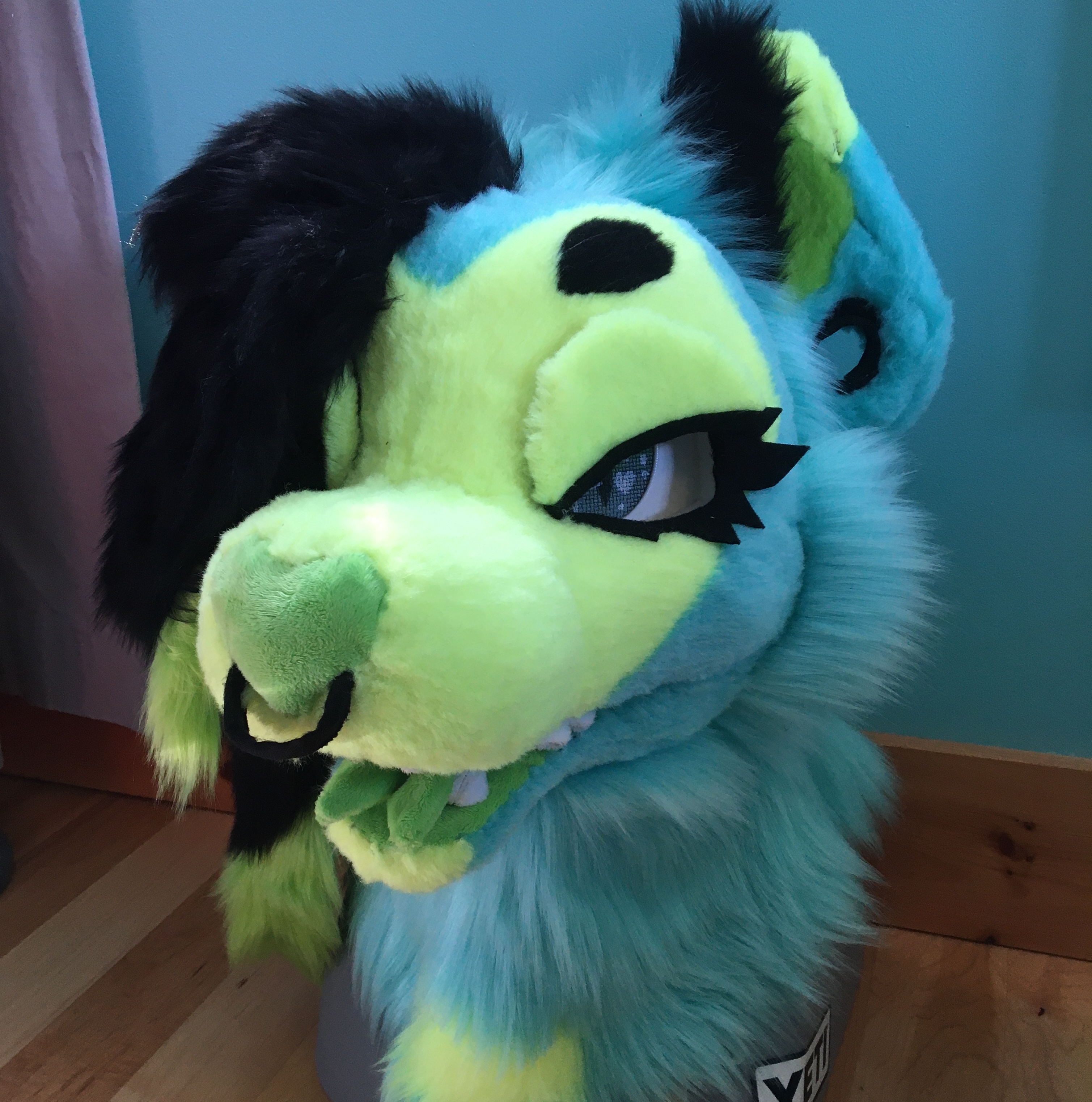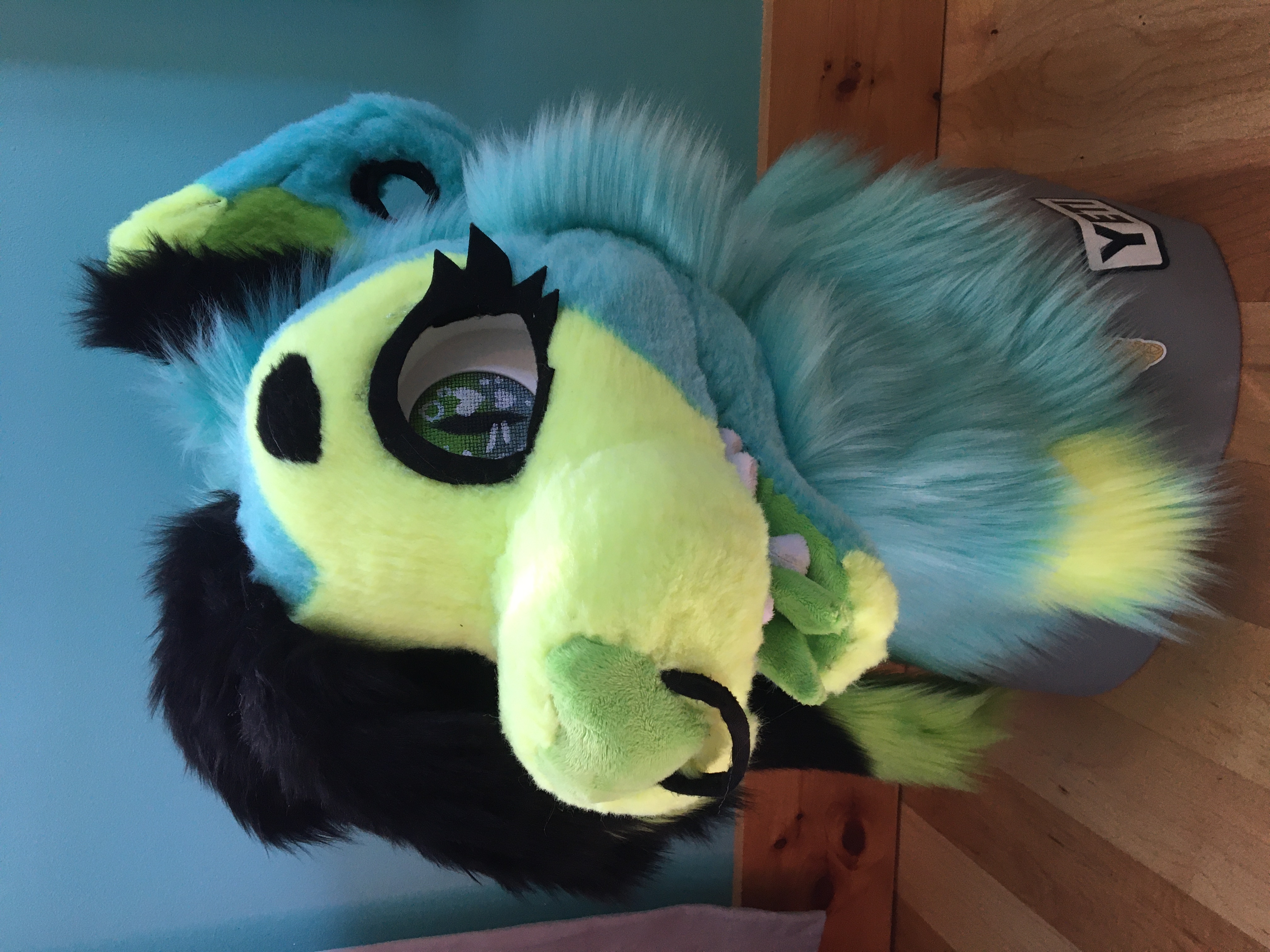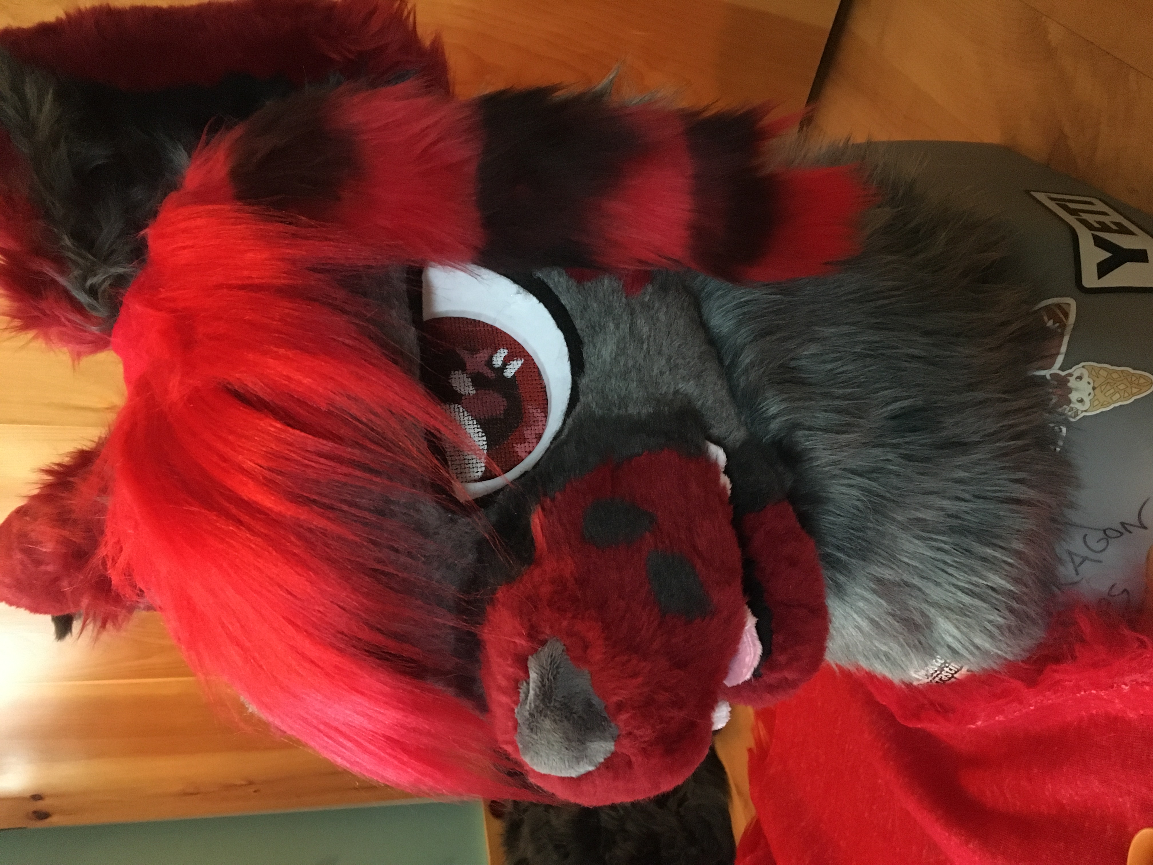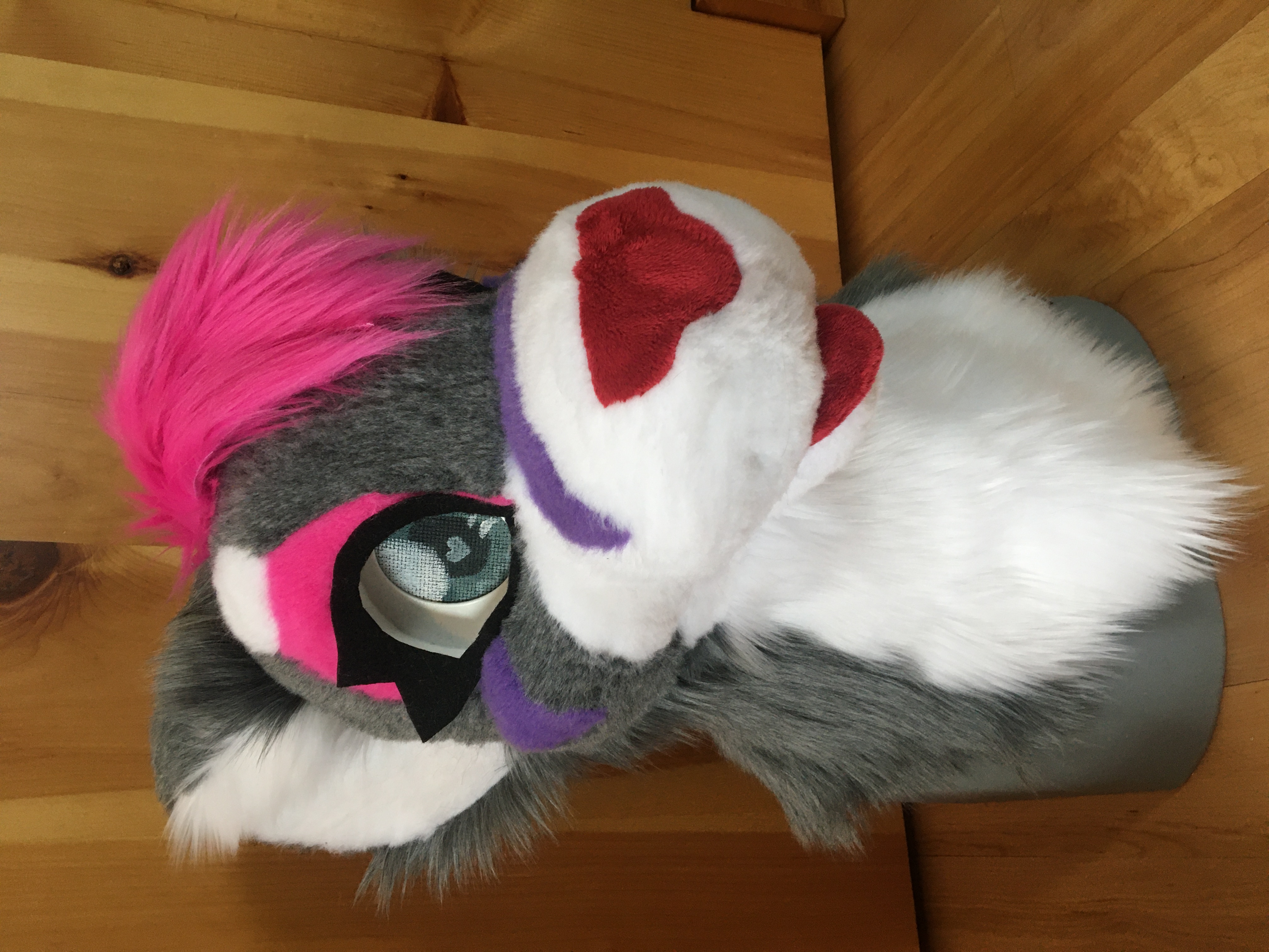 I bought the materials for this head with my birthday money in 2023. I was super happy to finally have a suit of my main sona. His hair is a giant stuffed piece attached to the back of his head. It's super heavy and is pretty uncomfortable to wear.
