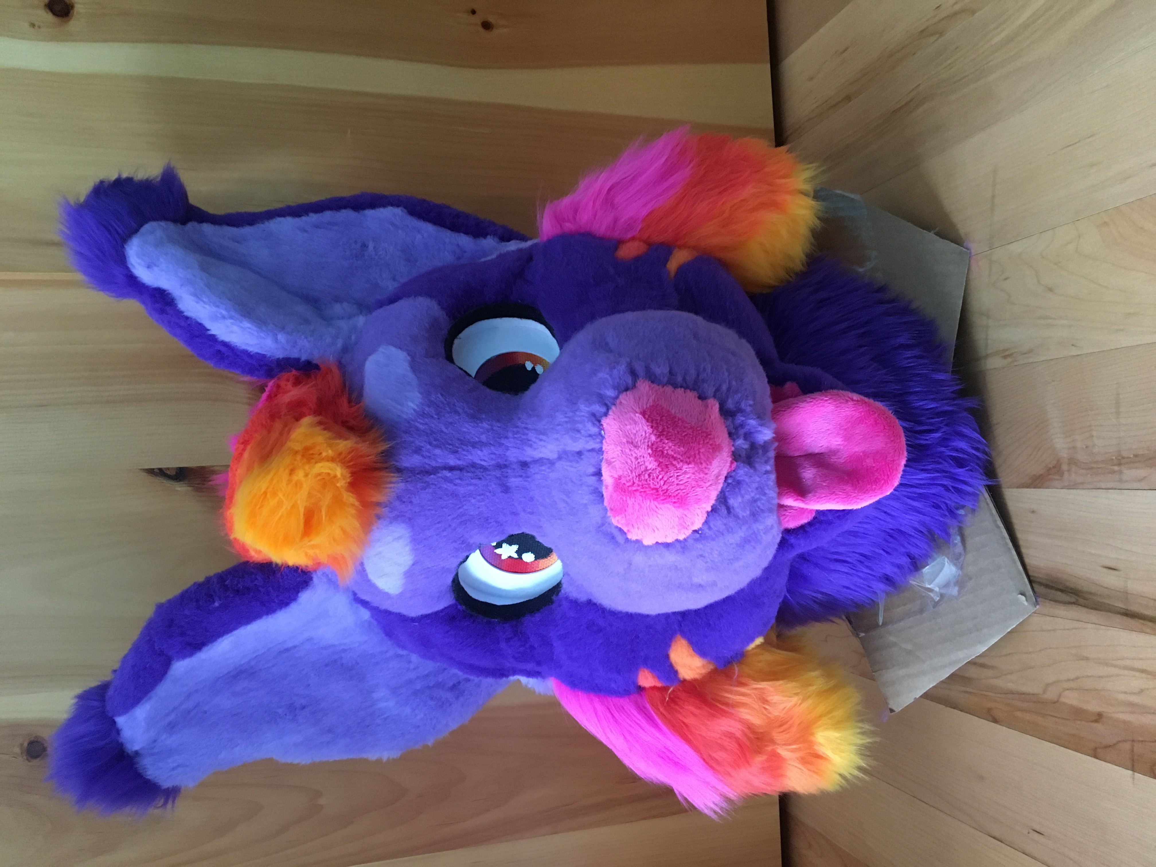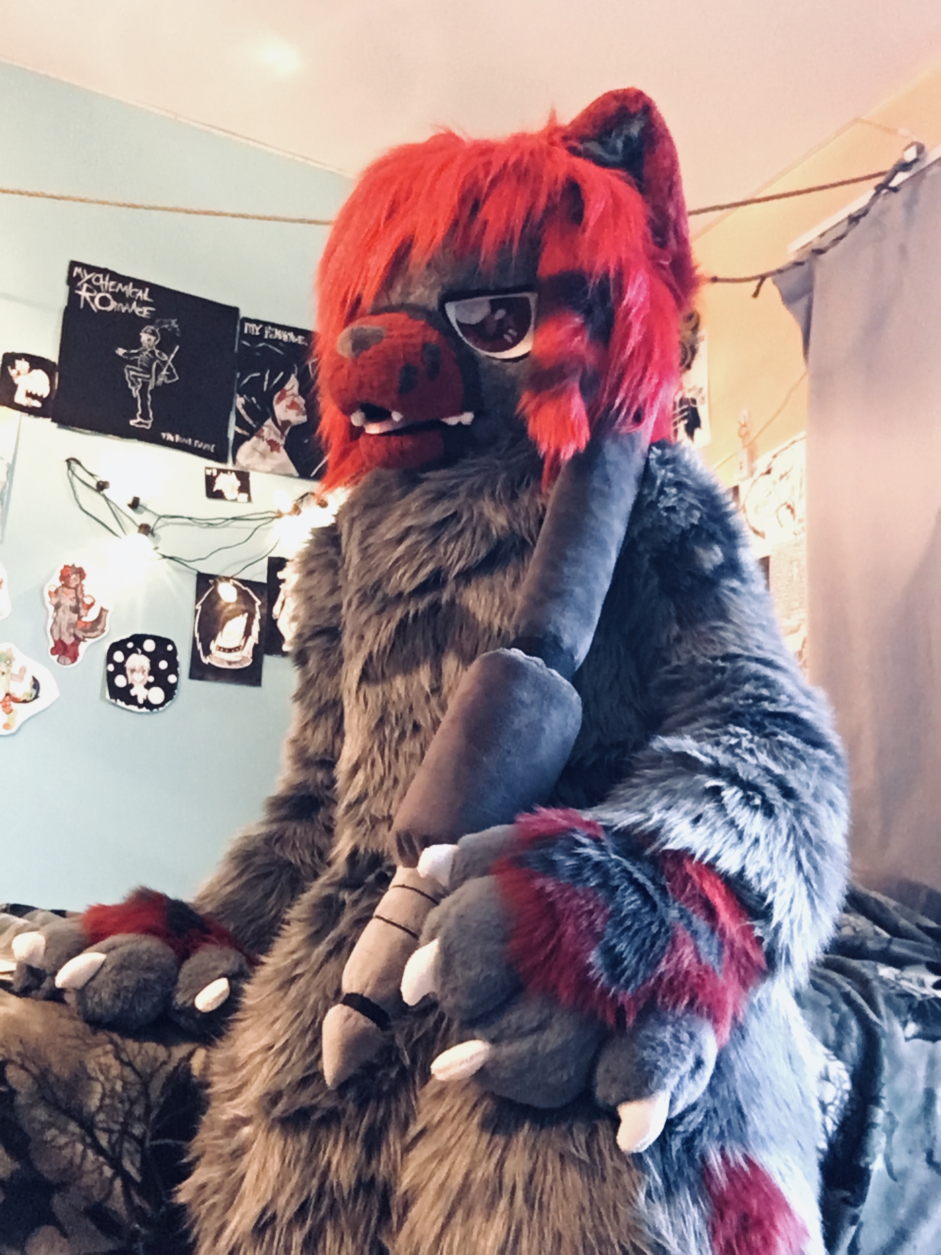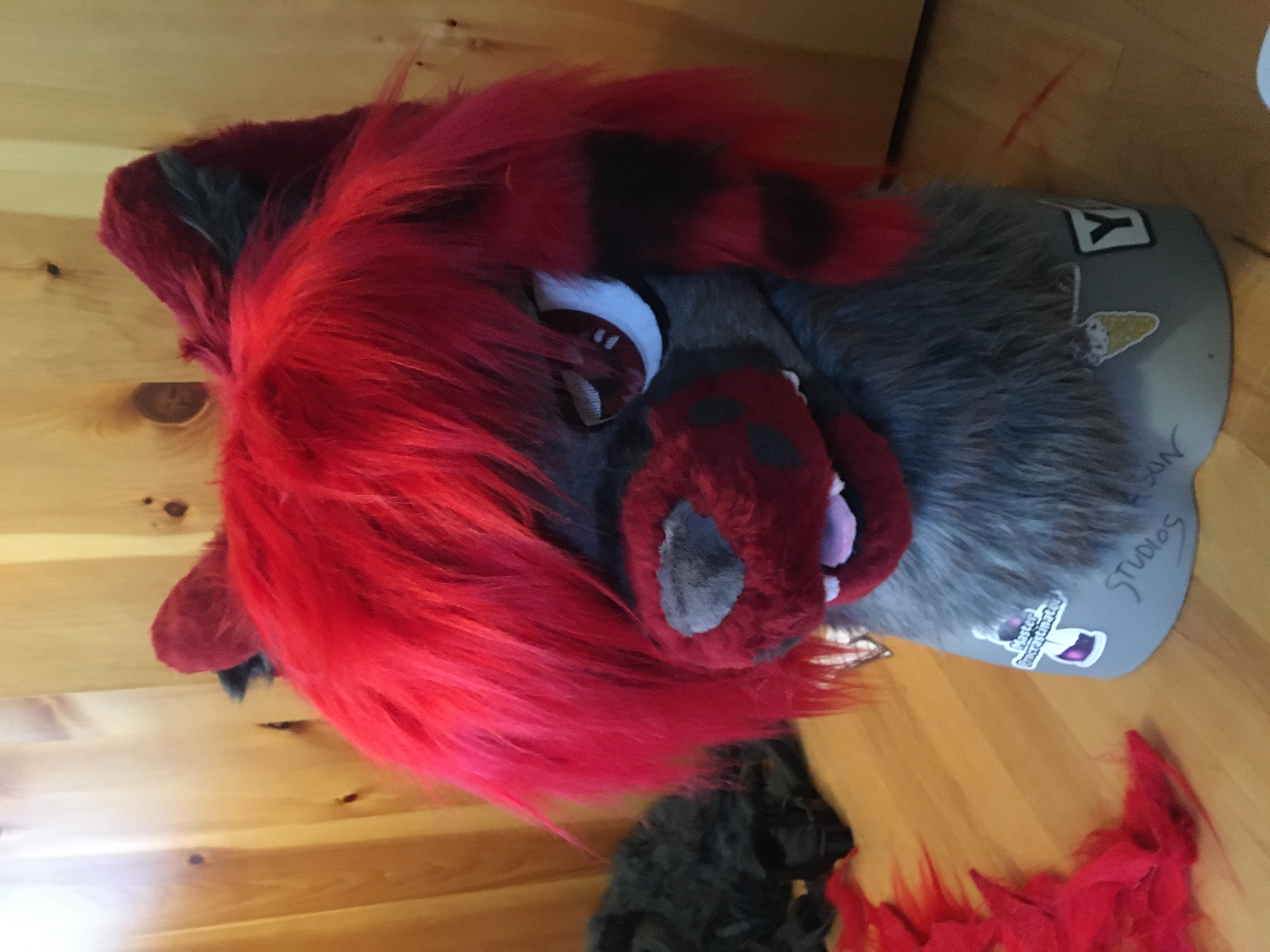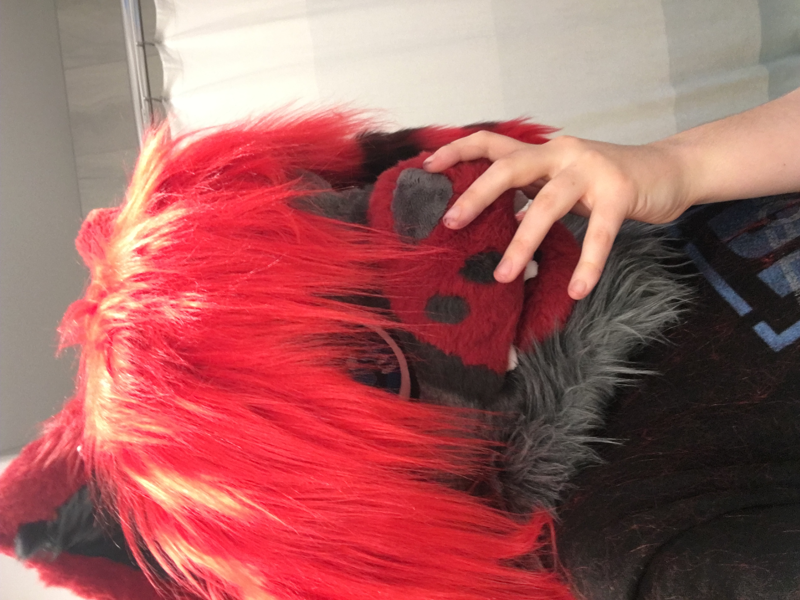 I bought the materials for this head with my birthday money in 2023. I was super happy to finally have a suit of my main sona. His hair is a giant stuffed piece attached to the back of his head. It's super heavy and is pretty uncomfortable to wear.
