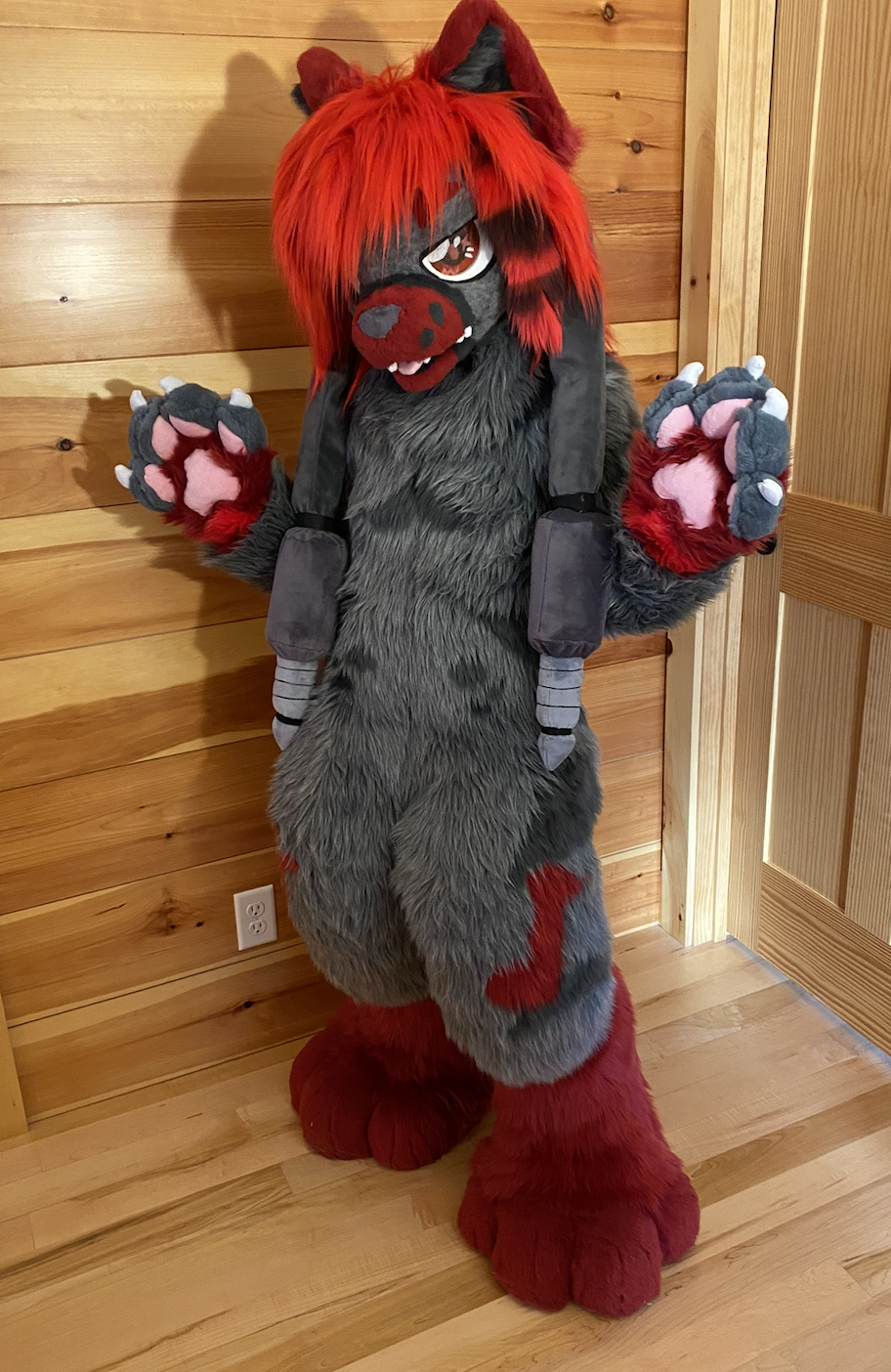 This suit marked a big shift in my suit style, opting for smaller snouts and bigger eyes. This was also my first time doing a full head of hair on a fursuit head.